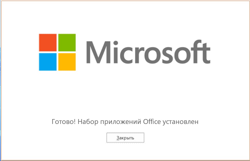 Далее начнется непосредственно сама установка приложения Microsoft Office. Дожидаемся ее окончания. Время установки зависит от скорости Вашего интернета и производительности ПК, как правило, установка длится не более 5–15 минут.