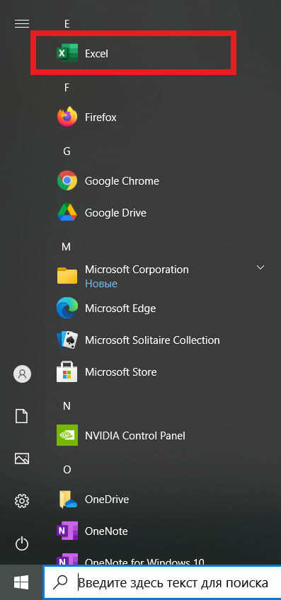 - Если у Вас Windows 10, заходим в меню «Пуск» => Далее ищем там любое приложение из пакета Office, пусть это будет Excel и запускаем его.